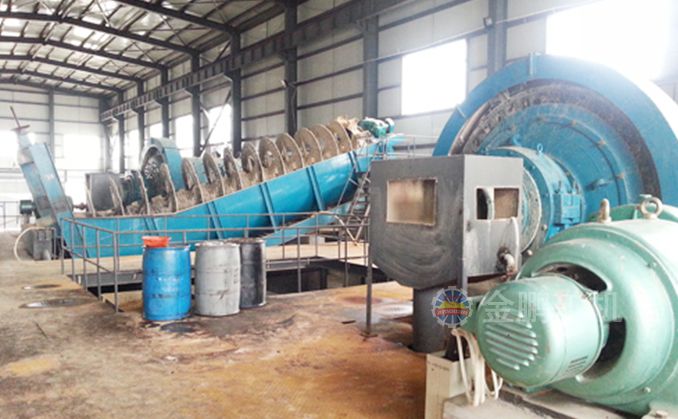 本工藝采用兩段一閉路破碎流程,合格產(chǎn)品進(jìn)入粉礦倉(cāng)緩存,礦石由擺式給礦機(jī)均勻的給到直筒節(jié)能格子型球磨機(jī)進(jìn)行磨礦,格子球磨機(jī)和高堰式單螺旋分級(jí)組成一段閉路磨礦分級(jí)流程。球磨機(jī)的排礦先經(jīng)過跳汰機(jī)富集大顆粒金,跳汰機(jī)底流通過兩段搖床選出30%品位的顆粒金,跳汰機(jī)的溢流進(jìn)入分級(jí)機(jī)。分級(jí)溢流經(jīng)過攪拌槽的調(diào)漿后進(jìn)入浮選系統(tǒng),通過做礦石的可選性實(shí)驗(yàn)研究我們選擇一粗三精三掃的浮選流程,從而很大程度的回收脈石中的有價(jià)金元素。浮選金精礦通過濃密機(jī)濃縮由過濾機(jī)完成脫水作業(yè),浮選尾礦由濃密機(jī)濃縮后進(jìn)入壓濾機(jī)進(jìn)行壓濾成濾餅做到尾礦干排。金礦重浮聯(lián)合流程也是金鵬集團(tuán)用于山東黃金集團(tuán)蓬萊大柳行選廠項(xiàng)目中的成功經(jīng)驗(yàn)。
