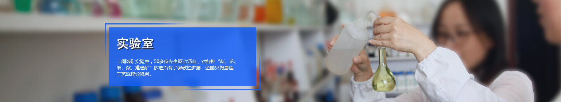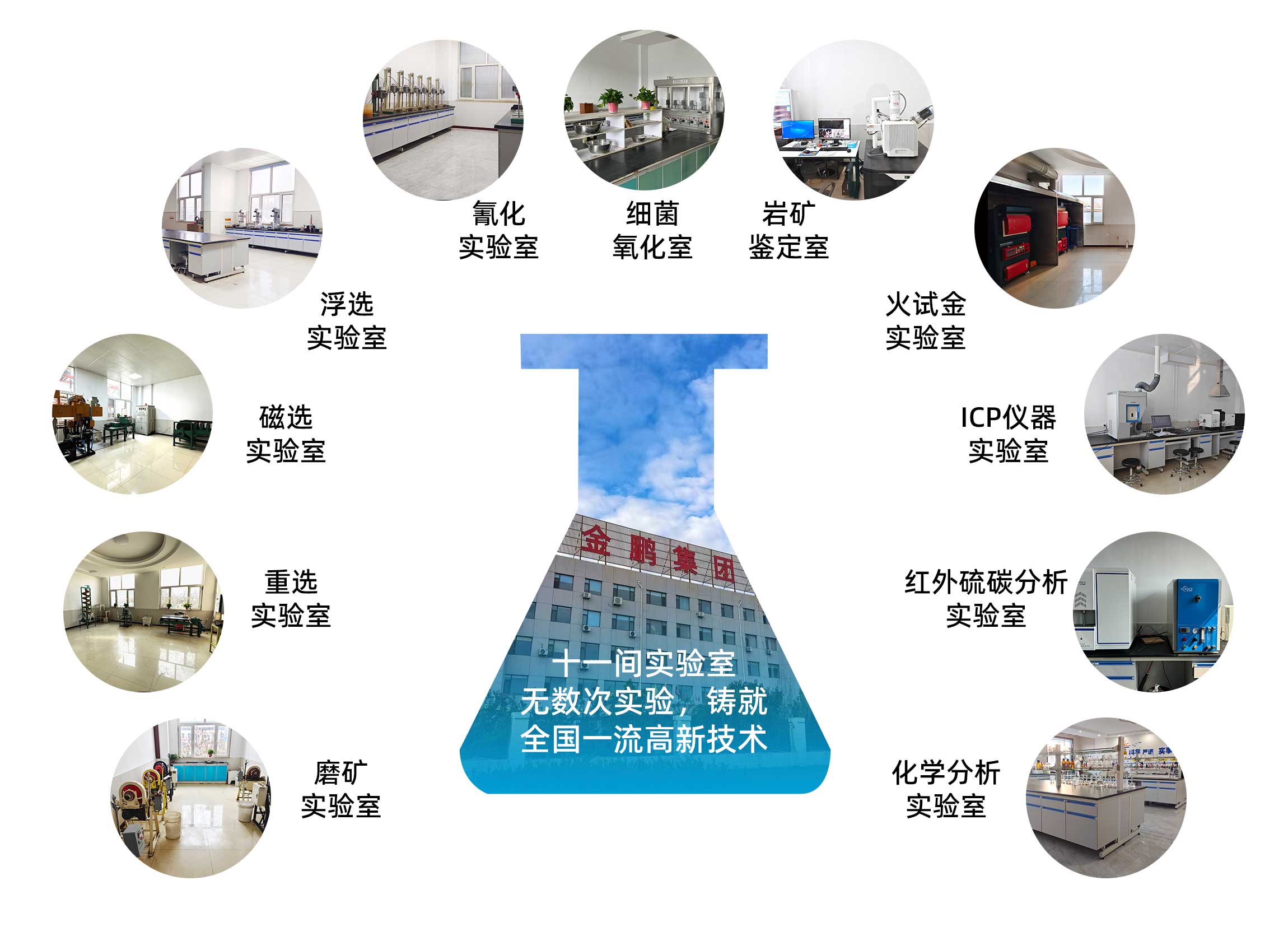 為了更好的進行選礦試驗研究工作,金鵬集團斥資打造了十一大先進的實驗室, 50多位選礦研究專家,先后承擔了上千個礦山項目實驗工作,經(jīng)驗豐富。實驗室 配備了完善的選礦實驗研究設備和巖礦鑒定設備。能夠進行各種有色金屬,黑色金屬 及非金屬復雜難選冶礦石的實驗研究工作。其中黃金、白銀、銅礦、鉛鋅礦、鎢鉬銻礦 、鈦鐵礦、錳礦、磁褐鐵礦、赤鐵礦選礦技術,鉀鈉長石、石英、螢石、石墨等非金屬 提純、各種氧化礦的回收、綜合利用等多項研究成果已處于國際國內領先水平。