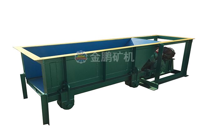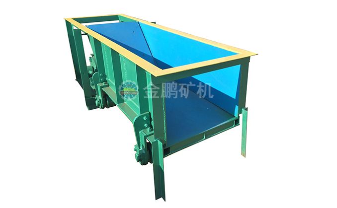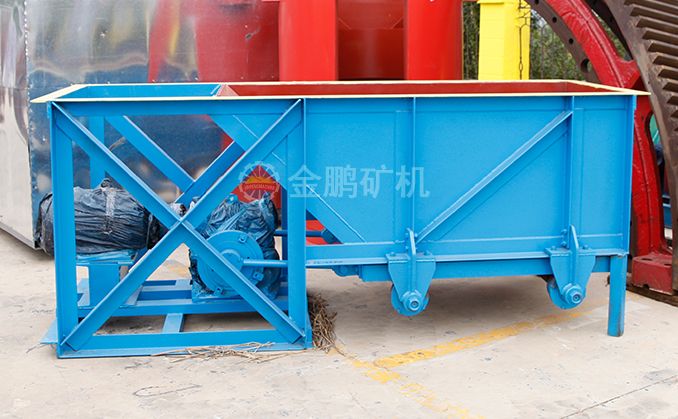 槽式給礦機設備一般安裝在料倉出料口下部,礦石落入槽體底部的漏板上,底部漏板設置在滾輪上,并通過偏心機構使漏板與雙出軸的減速機相連,然后通過聯(lián)軸器與電動機相接。工作時,由電動機通過聯(lián)軸器帶動減速機,并通過偏心盤與設備在槽架底部和滾輪之間的漏盤一起往復直線運動,從而完成均勻給料。