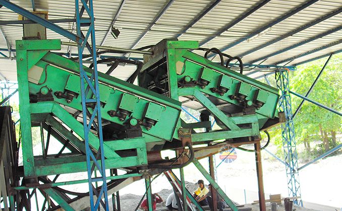 2、重選:黑鎢礦重選金鵬通常采用多級跳汰、多級搖床、中礦再磨的重選流程。細碎后合格礦經過振動篩分級后進行多級跳汰,產出跳汰重選毛砂,粗粒級跳汰尾礦進入磨機再磨,細粒級跳汰尾砂經過分級機后進入多級搖床選別,產出搖床重選毛砂,搖床尾礦排入尾礦庫,搖床中礦返回再磨再選,跳汰和搖床的重選毛砂進入精選作業(yè)。